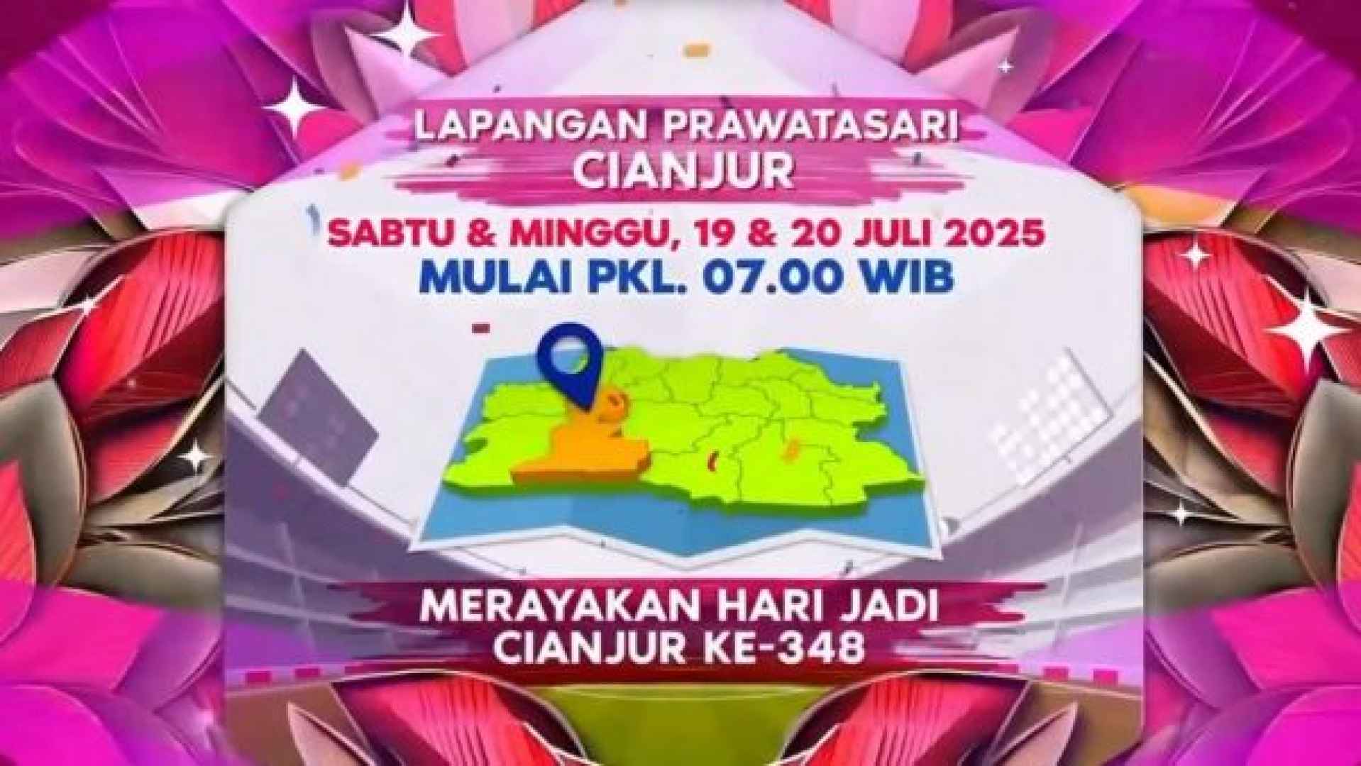 Dalam rangka memeriahkan Hari Jadi Cianjur ke-348, Pemerintah Kabupaten Cianjur berkolaborasi dengan stasiun televisi nasional Indosiar menggelar PESTA RAYA INDOSIAR – CIANJUR yang akan berlangsung selama dua hari penuh kemeriahan. Acara ini digelar di Lapangan Prawatasari, Cianjur, pada: Sabtu, 19 Juli 2025 pukul 07.00 – 22.00 WIB dan Minggu, 20 Juli 2025 pukul 07.00 – 14.00 WIB.