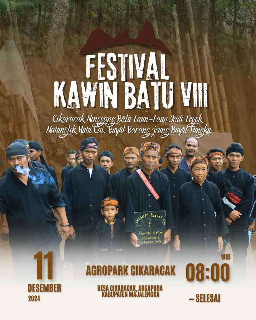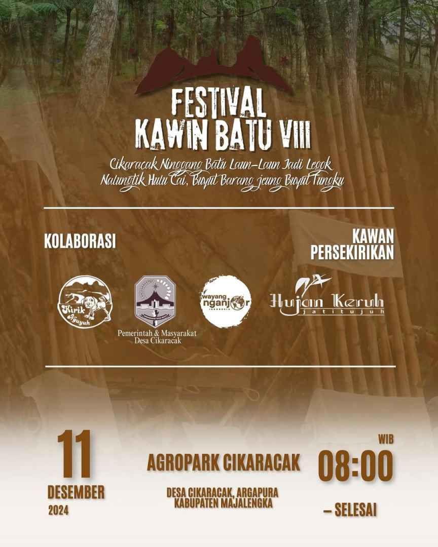 Festival Kawin Batu VIII merupakan sebuah perhelatan budaya hasil kolaborasi antara Padepokan Kirik Nguyuh dengan Pemerintah dan Masyarakat Desa Cikaracak. Mengusung tema peribahasa Sunda, “Cikaracak Ninggang Batu Laun-Laun Jadi Legok”, kegiatan ini menjadi refleksi perjalanan panjang yang menekankan pentingnya konsistensi, kerja keras, dan harapan dalam mewujudkan mimpi bersama. Festival ini bertujuan sebagai puncak dari upaya bersama untuk memberikan kebermanfaatan bagi lingkungan sekitar dan akan diselenggarakan pada Rabu, 11 Desember 2024, di Agropark Cikaracak.