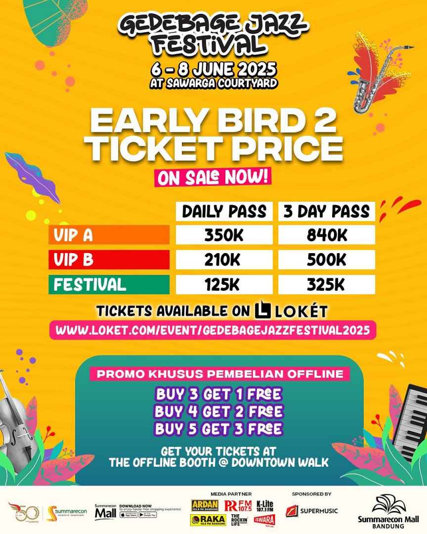 Gedebage Jazz Festival merupakan sebuah festival musik yang akan diselenggarakan selama tiga hari, mulai tanggal 6 hingga 8 Juni 2025, di Summarecon Mall Bandung. Acara ini akan dimeriahkan oleh deretan musisi ternama Indonesia, seperti Yura Yunita, Indra Lesmana, KLA Project, Kahitna, dan Erwin Gutawa. Tiket tersedia dalam beberapa kategori (VIP dan Festival) untuk pass harian maupun terusan tiga hari, yang dapat dibeli secara online melalui Loket.com atau secara offline di booth tiket Downtown Walk.