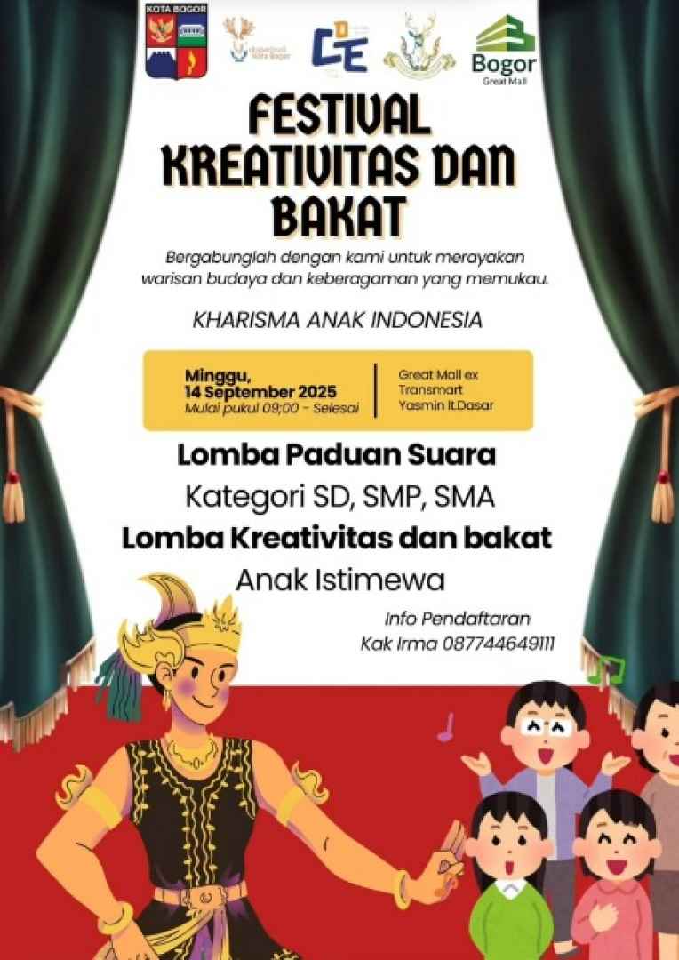 Festival Kreativitas dan Bakat "Kharisma Anak Indonesia" merupakan sebuah ajang kompetisi seni yang ditujukan bagi para pelajar dari tingkat TK hingga SMA. Kegiatan ini diselenggarakan dengan tujuan untuk merayakan warisan budaya dan keberagaman Indonesia, sekaligus menjadi wadah bagi generasi muda untuk menampilkan bakat mereka. Festival ini akan melombakan empat kategori, yaitu Tari Daerah Nusantara, Lagu Daerah Nusantara, Lomba Paduan Suara, Lomba Kreativitas dan Bakat untuk Anak Istimewa yang akan berlangsung pada hari Sabtu, 13 September 2025, di Great Mall, Bogor.