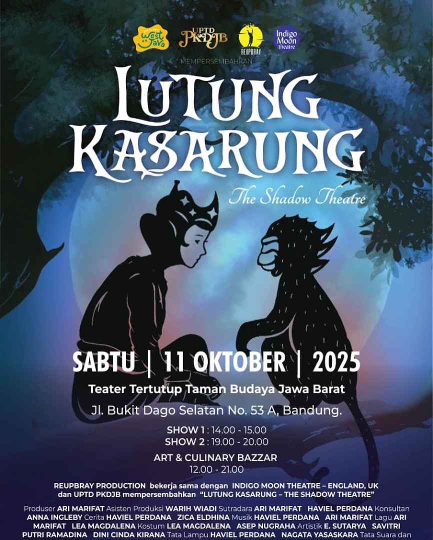 Saksikan kisah legendaris Lutung Kasarung dalam format teater bayangan magis, hasil kolaborasi Indigo Moon Theatre (UK) dan Reupbray Production. Pertunjukan akan digelar pada Sabtu, 11 Oktober 2025, di Taman Budaya Jawa Barat (Dago). Tersedia dua jadwal pertunjukan (pukul 14.00 & 19.00) serta bazaar seni dan kuliner. Tiket seharga Rp 100.000 dapat dipesan melalui narahubung yang tertera.