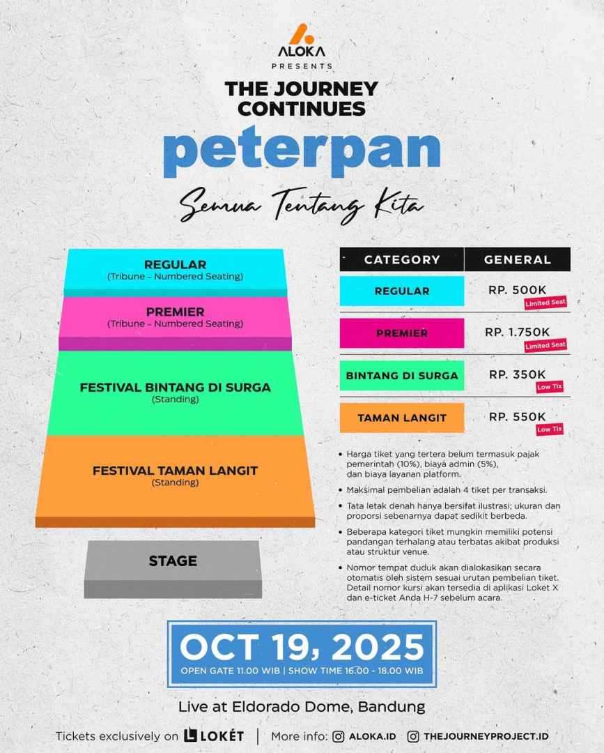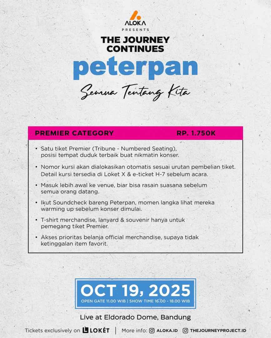 Peterpan kembali dalam konser bersejarah "The Journey Continues" pada hari Minggu, 19 Oktober 2025, di Eldorado Dome, Bandung, tepat 17 tahun sejak konser terakhirnya. Saksikan penampilan para personel asli bersama generasi baru vokalis seperti Ello, Tiara Andini, dan Fiersa Besari. Tiket "last chance" yang tersisa (mulai dari Rp 350.000) kini dijual secara eksklusif di LOKÉT.